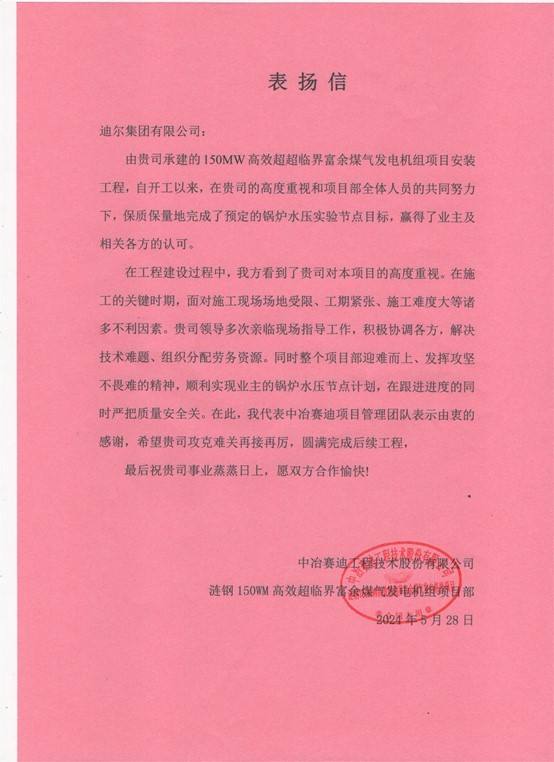 2024年5月28日,鑒于迪爾集團(tuán)國(guó)際工程公司湖南婁底項(xiàng)目部圓滿完成預(yù)定的超超臨界鍋爐水壓試驗(yàn)節(jié)點(diǎn)目標(biāo),中冶賽迪工程技術(shù)股份有限公司向項(xiàng)目部發(fā)來了表揚(yáng)信,對(duì)迪爾人在施工過程中展現(xiàn)出的專業(yè)能力、攻堅(jiān)精神和嚴(yán)謹(jǐn)作風(fēng)給予了高度評(píng)價(jià)和贊賞。